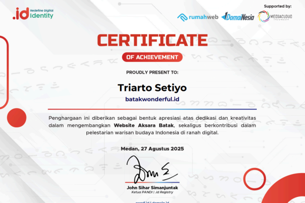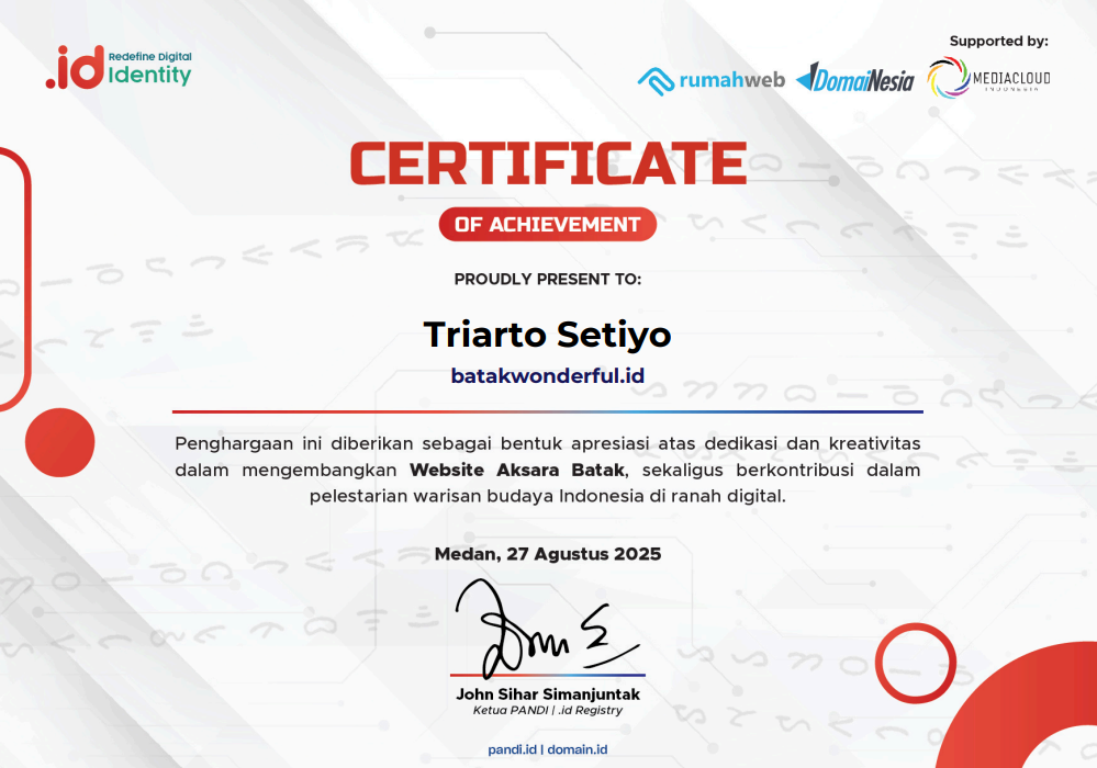 Triarto Setiyo Masuk 38 Finalis Lomba Website Aksara Batak yang Diselenggarakan PANDI Jakarta, 25 Agustus 2025 – Dalam upaya pelestarian budaya dan aksara daerah, Triarto Setiyo turut ambil bagian dalam Kompetisi Website Aksara Nusantara: Aksara Batak yang diselenggarakan oleh Pengelola Nama Domain Internet Indonesia (PANDI). Melalui karya situs batakwonderful.id, Triarto berhasil masuk ke jajaran 38…
