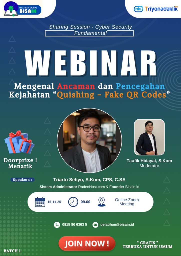 Bisain.id kembali menunjukkan komitmennya dalam meningkatkan literasi keamanan siber di Indonesia melalui gelaran Webinar Sharing Session Cyber Security Fundamental dengan tema “Mengenal Ancaman dan Pencegahan Kejahatan Quishing”. Acara ini diselenggarakan pada Sabtu, 15 November 2025, dan berhasil menarik antusiasme tinggi dengan 31 peserta terdaftar yang mengikuti rangkaian kegiatan hingga selesai.